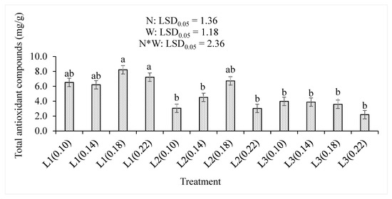 The levels of nitrogen and water supplied to the baby lettuces significantly (p < 0.05) affected the leaf concentration of total antioxidant compounds (Figure 4). The lowest supply of water with moderate nitrogen fertilizer level (L1(0.18) and L1(0.22)) showed 8.22% and 7.23% that were the higher TAO concentrations than any other treatment combinations. The 0.18 level of nitrogen showed highest TAO concentration on both L1 (8.22%) and L2 (6.72%). However, further increase in water supply resulted in non-significant differences in the L3 supply that had the lowest concentration of 2.19% at the L3(0.22) treatment combination. Increasing water supply decreased the TAO concentration of the lettuce leaf regardless of the increase in applied nitrogen levels. Increasing the nitrogen levels or the treatment combinations significantly (p < 0.001) increased the TAO concentrations, while the increase in water levels significantly (p < 0.001) decreased it (Table 2).