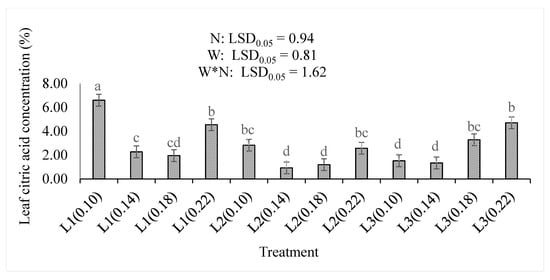 The leaf citric acid concentration was the highest (p < 0.05) at the lowest water supply and nitrogen level (L1(0.10)). Increasing the amount of nitrogen in L2 and L3 increased the leaf citric acid concentration (Figure 5). There was a non-significant difference between the lowest (0.10) and the highest (0.22) nitrogen levels in the L2 water supply. Increasing the amount of water supplied increased the positive response of leaf citric acid to the nitrogen application. However, the increase in water supply significantly reduced it. This is observed in L3 where the lower levels of nitrogen (0.10 and 0.14) had significantly lower citric acid concentrations than the higher levels (0.18 and 0.22). The concentration of leaf citric acid was significantly (p < 0.001) increased by increasing the nitrogen level, but significantly (p < 0.001) reduced by increasing the water supply or the treatment combinations (Table 2).