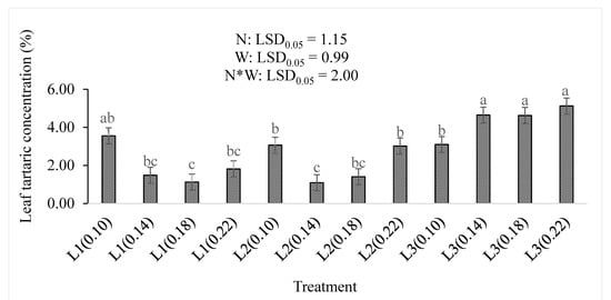 Increasing both the water supply and nitrogen levels increased the leaf tartaric concentration of the baby lettuce (Figure 6). There were no significant differences in the top three levels of the treatment interactions (L3(0.14), L3(0.18), and L3(0.22)). These levels were higher than any other treatment combination but not significantly higher than the L1(0.10) concentration (3.55%). The lowest tartaric acid concentrations of 1.12% and 1.09% were observed in the L1(0.18) and L2(0.14) treatment combinations, respectively. The concentration of the leaf tartaric acid was increased by increasing the water supply (p < 0.001), more than it was affected by the nitrogen level (p = 0.196) in this study (Table 2). The combinations of the treatments also contributed non-significantly (p < 0.05) to the increase in leaf tartaric acid concentration.