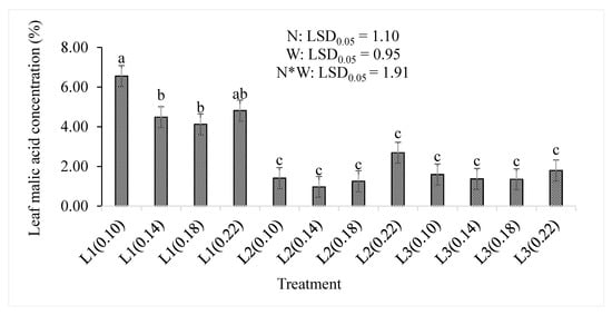 Supplying the lowest amount of water resulted in a significantly (p < 0.05) increased concentration of the leaf malic acid (Figure 7). Although the differences were not statistically significant between the lowest treatment combination (L1(0.10)) and L1(0.22), the L1(0.10) treatment showed the highest concentration (6.55%) than any other treatment combination. A further increase in water supply to L2 or L3 significantly decreased the concentration of leaf malic acid concentration regardless of the nitrogen level. The lowest concentration (0.97%) was observed in the L2(0.14) treatment combination. The leaf malic acid concentration was not significantly affected by the nitrogen level (p = 0.166) or the treatment combinations (p > 0.05) but was significantly (p < 0.001) reduced by the water supply (Table 2).