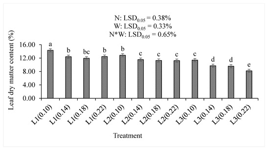 Increasing water supply significantly (p < 0.05) decreased the leaf dry matter percentages, irrespective of the nitrogen level (Figure 8). The highest combination of treatments (L3(0.22)) resulted in the lowest dry matter percentage (8.20%) compared to any other treatments. The highest dry matter percentage (14.32%) was observed in the L1(0.10) treatment combination. In L1, only L1(0.10) was significantly different to other L1 water supply. In L2, only the L2(0.10) was significantly different to other L1 water supply. The significantly high (11.39%) dry matter percentage was observed in the L3(0.10), while the L3(0.22) treatment combination had the lowest (8.20%) dry matter percentage in the L3 water supply. A significant (p < 0.001) decrease in the dry matter percentage resulted from increasing the nitrogen level or the water supply, as well as increasing treatment combinations (p < 0.05) in this study (Table 2).