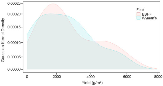 We found that both Wyman’s and BBHF fields had yield distributions that were heavily skewed toward the yield range 2200–2500 (g/m2) (Figure 2). Though the average yield in the BBHF field appeared higher compared to the Wyman’s field yield (Figure 2), the difference was not statistically significant (Table 2).
