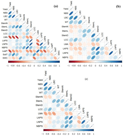 Pearson correlation heat map of the structural, functional, and yield-related traits of wild blueberries for (a) Wyman’s field, (b) BBHF field, and (c) the combined data from both fields. The horizontal axis represents the degree and direction of Pearson correlation r. The sign of the significance for each correlation is shown as ***, p < 0.001; **, p < 0.01; *, p < 0.05. For definitions of trait abbreviations, please see Table 1. LeafT, SoilT, and SWC data were only available for the Wyman’s field.
