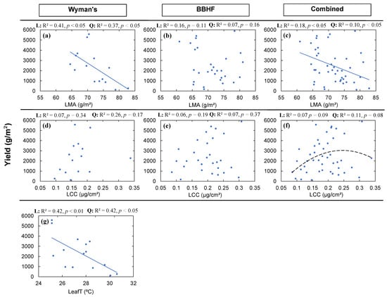 Yield (g/m2) of wild blueberry fields in relation to leaf mass per area (LMA) (a–c); leaf chlorophyll concentration(LCC) (d–f) and leaf temperature (LeafT) (g). The solid lines indicate significant (p < 0.05) linear relationships, and black lines indicate significant (p < 0.05) quadratic relationships. Dashed lines indicate marginally significant (p < 0.10) relationships. Here among all the structural and functional traits, only significant or marginally significant relationships to yield were plotted. The strongest relationship was chosen by the high level of significance (p-value) and higher coefficient of determination (R2). For definitions of trait abbreviations, please see Table 1.