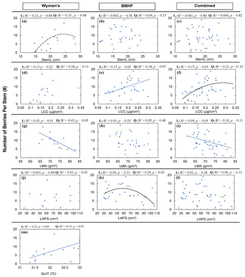 Average number of berries per stem (NBS) in wild blueberry fields in relation to average stem length (StemL) (a–c); average leaf chlorophyll concentration (LCC) (d–f); average leaf mass per area (LMA) (g–i); average leaf area per stem (LAPS) (j–l); and average soil temperature (SoilT) (m). The solid blue lines indicate significant (p < 0.05) linear relationships, and black lines indicate significant (p < 0.05) quadratic relationships. Dashed lines indicate marginally significant (p < 0.10) relationships. Here, among all the structural and functional traits, only significant or marginally significant relationships to NBS were plotted. The strongest relationship was selected from the high level of significance (p-value) and higher coefficient of determination (R2).