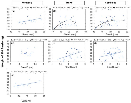 Berry size, indicated by the weight of 100 berries (WT), was found to be related to StemL, StemD, and SWC. These relationships were consistent among fields for StemL and WT (Figure 7a–c), but not for StemD (Figure 7d–f). We found a significant positive linear (Figure 7a: R2 = 0.32, p < 0.05) and marginally significant quadratic (Figure 7a: R2 = 0.32, p = 0.10) relationship for WT with StemL among genotypes in the Wyman’s field, whereas for the BBHF field, we found no significant relationships for the BBHF field (Figure 7b) or for the combined data (Figure 7c). We found significant positive linear and quadratic relationships (Figure 7e) for the BBHF field as well as for the combined data of two fields between StemD and WT, but no relationship was found for the Wyman’s field. We also found a significant increase in WT with an increase in SWC (Figure 7g: R2 = 0.27, p < 0.05).