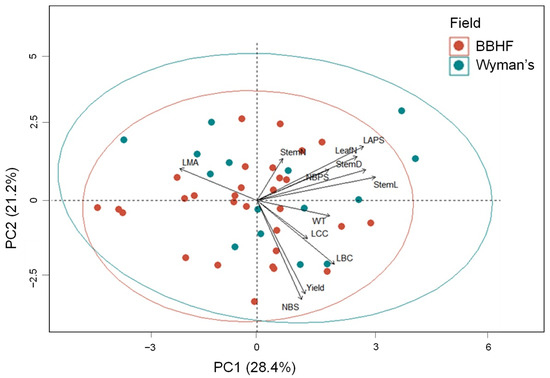 In the PCA analysis of the observed common structural and functional traits of the Wyman’s and BBHF field, principal component axis 1 (PC1) explained 28.4% while principal component axis 2 (PC2) explained 21.2% of the total variance (Figure 8). The PC1 was positively associated with stem structural traits StemL, StemD, and leaf size-related traits (LeafN and LAPS) and negatively with LMA. The PC2 was positively associated with leaf size-related traits (LeafN and LAPS), and negatively associated with yield and the yield-related traits NBS, LBC, and WT. The first principal component axis (PC1) represented a trade-off between investment in leaf toughness and endurance vs. investment in structural features, while the second principal component (PC2) represented a trade-off between productivity and investment in leaf structure.