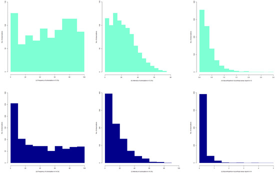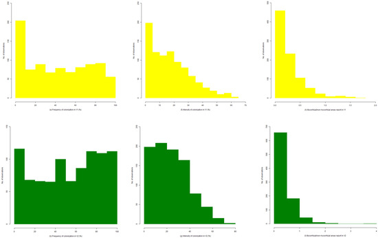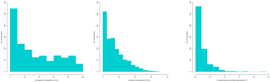 A histogram analysis of each parameter, in relation to applied treatments, was chosen as a pairwise comparison between data distribution and their potential to indicate the colonization strategy. Colonization frequency (Figure 1a–e) varies largely in the interval 0–100%, with sequential similar distributions. The control variant presented 30% of the observations in the interval 0–20%, compared to the highest values of treatments (V4 and V5), where this parameter has a similar distribution and a supplemental 100 observations in the same interval. For these three variants, the remaining two-thirds of observations are split within the rest of frequency classes, with at least 100 observations for each class. Contrasting, organic and low-mineral organic variants (V2 and V3) show more equilibrated colonization frequencies. There is a visible polarity of colonization frequency, with equal observations in the interval 0–20% and 80–100%. The entire colonization presence is visible for these two variants.