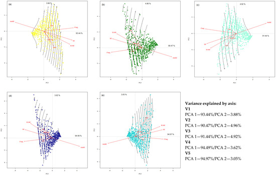The differences between low (V3) and high (V5) mineral doses applied with organic treatments are highly visible in the position of PCA vectors and the dispersion of data (Figure 2c,e). The isolines of colonization degree are larger in the case of low-mineral treatment (V3), with a short vector of arbuscules, which restrict the formation of these structures. As an opposite, a lower colonization degree and tight isolines are associated with high-mineral treatment (V5). For this treatment, the arbuscules vector is long, but it is associated with a highly dispersed set of data.