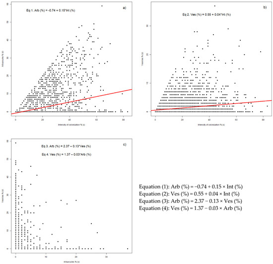 Interdependency between colonization parameters in F. rubra involved in the direction of colonization strategy: (a) Arbuscules vs. Intensity of colonization; (b) Vesicles vs. Intensity of colonization; (c) Arbuscules vs. Vesicles. Legend: Int—colonization intensity; Arb—arbuscules abundance; Ves—vesicles abundance; * means multiply.