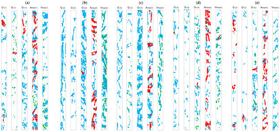 Mycorrhizal patterns and fungal strategy in roots of F. rubra as shaped by long-term applied treatments. (a) V1 (control variant)—untreated; (b) V2—organic (manure) treatment—10 t ha−1 manure; (c) V3—low-mineral organic treatment—10 t ha−1 manure + 50 N 25 P2O5 25 K2O; (d) V4—mineral treatment—100 N 50 P2O5 50 K2O; (e) V5—high-mineral organic treatment—10 t ha−1 manure + 100 N 50 P2O5 50 K2O. Legend to color codes and colonization strategies: blue—hyphae; red—arbuscules; green—vesicles (as detailed in Table 2). Legend to map codding: (1–5)—treatments V1 to V5; G[1–5]—general median model; G−[1–5]−½ of general model; G+[1–5]—2× general median model; Amax[1–5]—maximum arbuscules model; Vmax[1–5]—maximum vesicles model.