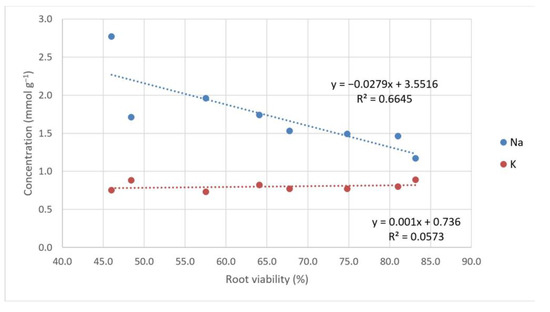 According to the Pearson correlation matrix (Table S4), the biomass production of the varieties, especially the shoot biomass, was highly correlated with the potassium content of the shoot (0.864**), the chlorophyll content (0.794*), and the Na/K ratio (−0.718*). Root biomass also influenced the Na/K ratio of the root (0.772*), but it was not correlated with dehydrogenase activity (−0.093). We detected a medium, but not significant, correlation between root viability and Na+ (−0.532) and K+ (0.618) concentrations in the root. Figure 1 shows the relationship between root viability and Na+ and K+ concentrations in the leaves. Increasing root viability significantly correlated with sodium concentration in the leaves (−0.805*, R2 = 0.6645), but it did not affect the K+ concentration in the leaves.