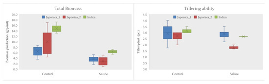 Total biomass production and tillering ability under control and saline treatment among rice varietal groups.