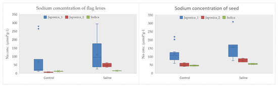The sodium content of ripened grains was significantly higher under salinity stress (p < 0.001) than in the control condition. The lowest value was observed in indica (2.41 µmol g−1), the second-lowest was observed in the japonica_2 (3.39 µmol g−1), and the highest was observed in the japonica_1 group (7.17 µmol g−1) (See Figure 3). The varietal differences show that ‘Dunghan Shali’ had a stable sodium concentration, while the value of the others increased. The highest sodium content was detected in the case of ‘M488’ (13.57 µmol g−1).
