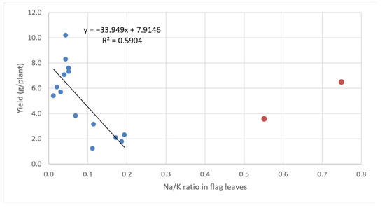 The relation between Na/K ratios in flag leaves and the yield of eight rice varieties under control and saline conditions. All dots show the average of three measurements. The red dots indicate the ‘M488’ variety.