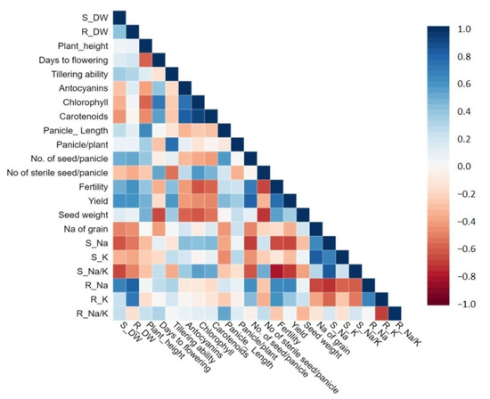 Pearson correlation among studied parameters. The correlation matrix contains the mean of the rice varieties’ data together under control and saline conditions.
