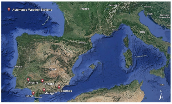 Spatial distribution of Aroche, Conil, Córdoba, Málaga, and Tabernas in the Andalusia region, south of Spain.