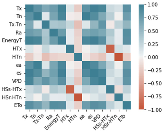 In this work, because the accurate estimation of ET0 using limited meteorological data has been improved in recent years [14,24] and due to the high availability of temperature records, only temperature-based and ET0 values from the past have been used as input features to forecast ET0. Specifically, two different windows have been evaluated, the use of 15 and 30 days from the past. Moreover, several temperature-based variables have been calculated, such as EnergyT (the area below the intraday temperature in a whole day), HourminTx (the time when Tx occurs), HourminTn (the time when Tn occurs), HourminSunset (the time when sunset occurs), HourminSunrise (the time when sunrise occurs), es (mean saturation vapor pressure), ea (actual vapor pressure) and VPD (vapor pressure deficit), Tx-Tn, HourminSunset-HourminTx, and HourminSunrise-HourminTn. All the configurations assessed in this work contained Tx, Tn, Tx-Tn, and Ra as features due to their very high Pearson correlation (Figure 2), and the rest of the configurations were selected based on their Pearson correlation values and the previous results on these same locations regarding ET0 and solar radiation [24,25,26] estimations. The 27 different assessed configurations are shown in Table 3.