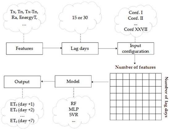 In machine learning applications, a vital prerequisite to guarantee accurate modeling is the use of reliable datasets. In this work, the control guidelines reported by Estévez et al. [6] have been followed to identify erroneous and questionable data from sensor measurements by applying different tests (range, internal consistency, step, and persistence) and a spatial consistency test [27]. These quality assurance procedures have been successfully employed in different countries [4,28,29]. Afterward, the input and output matrices had to be built depending on the number of lag days from the past (15 or 30), the features to use (up to 27 input configurations), and the number of days to forecast (up to 7 days). In Figure 3 and Figure 4, a mind map with all the possibilities is shown. It is worth noting that a MIMO (Multiple Input Multiple Output) approach was used in models that allowed it, whereas a direct approach was considered in the others according to the results of Ferreira and da Cunha [18].
