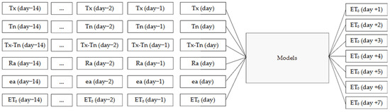 Consequently, using configuration 1 and 15 lag days as an example, the values from day to day—14 of Tx, Tn, Tx-Tn, Ra, ea, and ET0 are used as input features (a total of 90 values) for all the ML models (except for transformers—see Section 2.5.7), where Tx and Tn are directly given by AWS, and Ra and ea can be calculated using Tx, Tn, and the latitude, as stated by [2]. Finally, ET0 is calculated using the well-known FAO56-PM method.