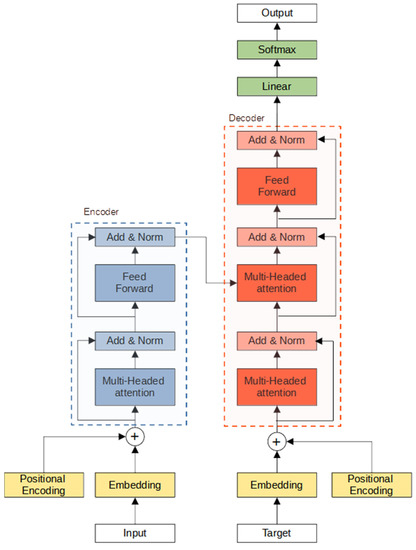 A new state-of-the-art architecture has been recently presented for NLP problems, the transformers [19]; see Figure 7. One of the main motivations of transformers is to deal with the vanishing gradient problem of LSTM when working with long sequences. Although LSTMs can theoretically propagate crucial information over infinitely long sequences, due to the vanishing gradient problem, they pay more attention to recent tokens and eventually forget earlier tokens. In contrast, transformers use an attention mechanism, which learns the relevant subset of the sequences to accomplish the specific task. For a single head, the operation can be expressed as Equation (4),