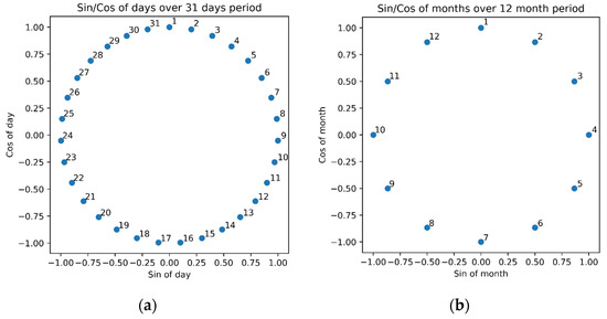 Sine/cosine positional encoding for 31 days in a month (a) and 12 months in a year (b).