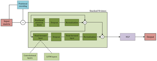 The architecture used in this work can be seen in Figure 9. It is based on the original transformer architecture from Vaswani et al. [19] and the attention-based architecture of Song et al. [42]. Several aspects were modified. First, since the input data already have numerical values, the embedding layer was omitted. Then, the positional encoding included new features in the input matrix instead of adding their values to the “embedded vector”. Consequently, four more features were used in this model (sine and cosine positional encoding for days in a month, and sine and cosine positional encoding for months in a year). Finally, the SoftMax layer was also deleted because we are dealing with a regression problem (forecasting ET0). Thus, the processing of data in the proposed transformer-based model can be described as follows. Firstly, the input matrix passes through a positional encoding mechanism. Then, the positional encoding features are added to the input matrix. Later, the data go to an attention-based block containing multi-head attention, dropout, normalization, addition, and feed-forward layers. Two different variations have been tested depending on the model used in the feed-forward layer: TransformerCNN, where a convolutional approach has been used, and TransformerLSTM, where an LSTM approach has been implemented. Eventually, the processed data go to an MLP model to carry out the regression task. The following works provide further details [19,21,43,44] and the code can be checked at the AgroML GitHub repository.