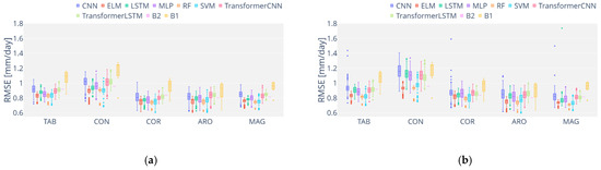Boxplot with RMSE values from all models and configurations in the different AWS, using 15 lag days (a) and 30 lag days (b).