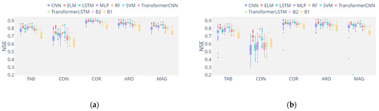 Boxplot with NSE values from all models and configurations in the different AWS, using 15 lag days (a) and 30 lag days (b).