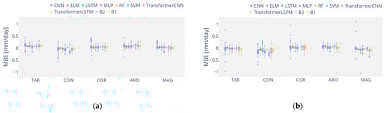 Table 4 and Table 5 show the RMSE and NSE performance for the baselines along the different forecast horizons (up to 1 week), where B1 refers to the moving average of the last seven ET0 values and B2 the use of mean historical monthly ET0 values (mean ET0 values for each month of the year). Generally, B2 outperformed B1 for all the forecast horizons except for one day ahead, where B1 performed better in all sites. Moreover, B1 obtained the most accurate forecasts on the one day ahead horizon, and it gradually dropped when the forecast horizon increased. In Aroche, the most humid site, the best performance in both RMSE and NSE values was obtained (NSE = 0.9038 and RMSE = 0.6390), followed by Córdoba, Málaga, Conil, and Tabernas (the most arid site), in this order. This suggests a relationship between the aridity index, distance to the sea, and the performance of the models. In inland locations, the higher the aridity index, the fewer the forecasting errors. On the other hand, in coastal locations, the opposite occurs. The higher the aridity index and the farther from the sea, the more precise the ET0 modeling. Finally, Table 6 shows the MBE values for the different stations and forecast horizons. In this case, B1 outperformed B2 in most of the cases.