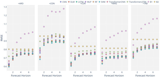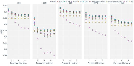 To further analyze these results, Figure 13, Figure 14 and Figure 15 show the best statistic values (NSE, RMSE, and MBE, respectively) of all the models and sites for the different forecast horizons used. In terms of NSE (Figure 13), all ML models highly outperformed B1 and B2 in all the forecast horizons and locations, except for Conil. In Conil, only SVM, RF, and ELM outperformed both B1 and B2 in all cases. On the other hand, the transformers, CNN, and MLP models underperformed B1 and B2 for a horizon higher than 3 days. Regarding RMSE, the results were similar to those shown in Figure 12. However, a more significant improvement in ML models is appreciated for most models and horizons. In terms of MBE (Figure 13, Figure 14 and Figure 15), B2 obtained significantly worse results in Aroche, Córdoba, Málaga, and Tabernas, where ML performed very accurately in all cases. In Conil, there were no major differences in performance between all the models. Thereby, due to these results, it could be stated that the use of ML models to forecast ET0 up to a week is highly recommended, especially SVM, RF, and ELM models. Generally, B1 highly outperformed B2 to forecast ET0 values one day ahead, but its performance profoundly decreased for higher horizons, obtaining even worse results than B2. This denotes a low autocorrelation of daily ET0 values but a higher relation with historical monthly values. Moreover, SVM generally showed the best performance in terms of NSE and RMSE, whereas, regarding MBE, all models performed very accurately. Finally, it is worth noting that in Conil (a coastal site with an aridity index close to being a dry sub-humid climate), the best ML models (SVM, RF, and ELM) could not highly outperform B2 as in the rest of the locations when forecasting more than two days ahead, due to the effect of the close distance to the sea and the higher aridity index.