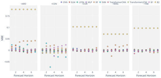 MBE values for ET0 forecast during seven forecast horizons and the two empirical baselines (B1—using the average value from the last seven days—and B2—using the mean daily monthly value from the training dataset).