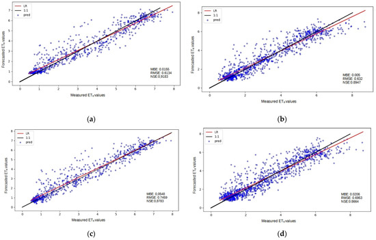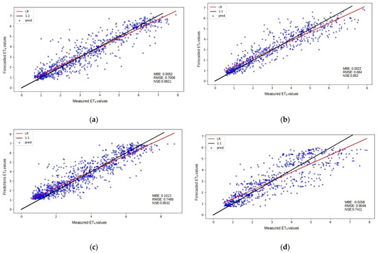 Scatter plot for measured vs. predicted values for (a) forecast horizon 1 in Tabernas, (b) forecast horizon 1 in Conil de la Frontera, (c) forecast horizon 7 in Tabernas, and (d) forecast horizon 7 in Conil de la Frontera.