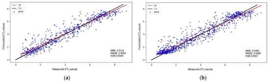 Scatter plot for measured vs. predicted values for (a) forecast horizon 1 in Córdoba, (b) forecast horizon 7 in Córdoba.
