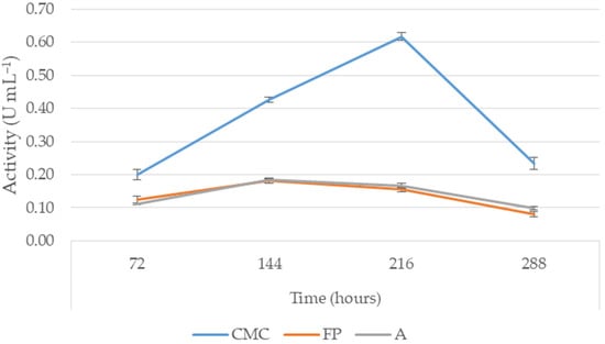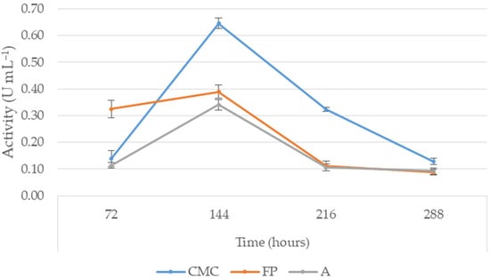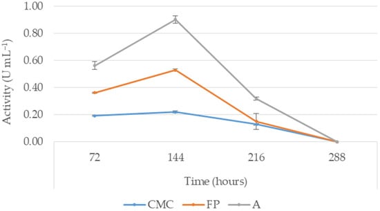 FPase production was detected after 72 h of incubation. The highest FPase production value was found after 144 h of incubation with Avicel cellulose—0.903 U mL−1 (Figure 3).