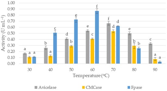 Figure 4. Effect of temperature on cellulase (CMCase, FPase, Avicelase) activity of Bacillus sp. 8E1A. Different letters above the bars (a, b, c…) indicate statistically significant differences among cellulases’ activity at different temperatures.