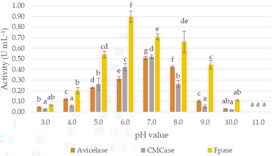 Figure 5. Effect of pH on cellulase (CMCase, FPase, Avicelase) activity of Bacillus sp. 8E1A. Different letters above the bars (a, b, c…) indicate statistically significant differences among cellulases’ activity at different pH values.