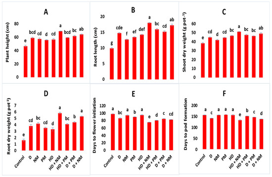 Effect of animal manures with DAP fertilizer on plant growth and root–shoot biomass of chickpea (A) plant height, (B) root length, (C) shoot dry weight, (D) root dry weight, (E) days to flower initiation and (F) days to pod formation of chickpea D: Recommended DAP; NM: Normal manure; PM: Processed manure; HD: Half of the recommended dose of DAP. Figure bars are showing the mean values (n = 3). All means followed by different letters have statistically significant differences according to Tukey’s HSD test at probability level of 0.05.