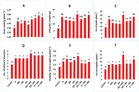 Effect of animal manures with DAP fertilizer on nodulation and yield attributes of chickpea (A) grain yield, (B) 100 grain weight, (C) No. of pods per plant, (D) No. of primary branches, (E) Nodular fresh weight and (F) No. of nodules per plant of chickpea. D: Recommended DAP; NM: Normal manure; PM: Processed manure; HD: Half of the recommended dose of DAP. Figure bars are showing the mean values (n = 3). All means followed by different letters have statistically significant differences according to Tukey’s HSD test at probability level of 0.05.