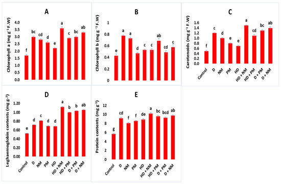 Effect of animal manures with DAP fertilizer on physiological attributes of chickpea (A) chlorophyll a, (B) chlorophyll b, (C) carotenoid contents, (D) leghaemoglobin contents and (E) protein contents of chickpea. While D: Recommended DAP; NM: Normal manure; PM: Processed manure; HD: Half of the recommended dose of DAP. Figure bars are showing the mean values (n = 3). All means followed by different letters have statistically significant differences according to Tukey’s HSD test at probability level of 0.05.
