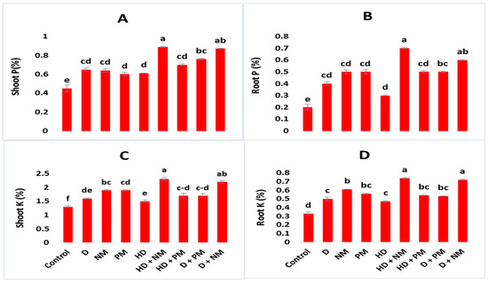 Effect of animal manures with DAP fertilizer plant minerals contents of chickpea (A) shoot phosphorus contents, (B) root phosphorus content, (C) shoot potassium content and (D) root potassium content of chickpea D: Recommended DAP; NM: Normal manure; PM: Processed manure; HD: Half of the recommended dose of DAP. Figure bars are showing the mean values (n = 3). All means followed by different letters have statistically significant differences according to Tukey’s HSD test at probability level of 0.05.