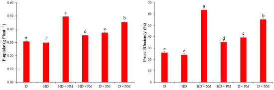 Effect of animal manures with DAP fertilizer on plant phosphorus contents uptake (%) and phosphorus use efficiency (%). D: Recommended DAP; HD: Half of the recommended dose of DAP; NM: Normal manure; PM: Processed manure. Figure bars are showing the mean values (n = 3). All means followed by different letters have statistically significant differences according to Tukey’s HSD test at probability level of 0.05.