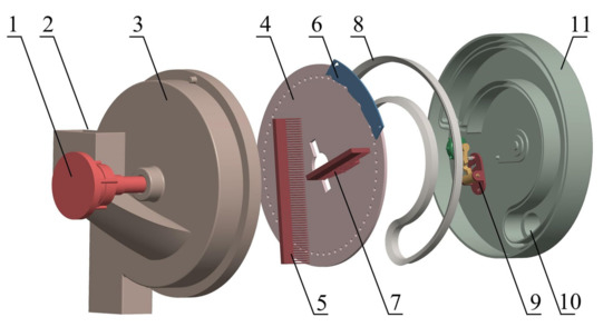 Profile of the structure of the air-suction seed-metering device: (1) Transmission shaft; (2) seed inlet; (3) seed-metering device main shell; (4) seed-metering plate; (5) seed-blocking brush; (6) seed-cleaning knife; (7) impurity-removal brush; (8) sealing air cushion; (9) seed-unloading mechanism; (10) suction inlet; (11) air-chamber shell.
