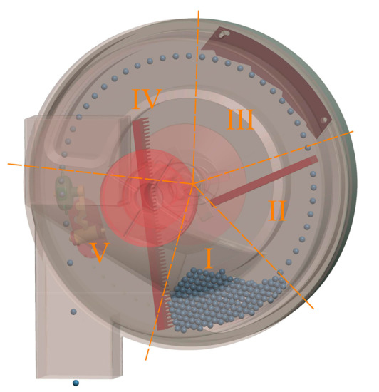 Schematic representation of working area division of the seed-metering device: (I) seed-filling area; (II) transition area; (III) seed-clearing area; (IV) seed-carrying area; (V) seed-unloading area.