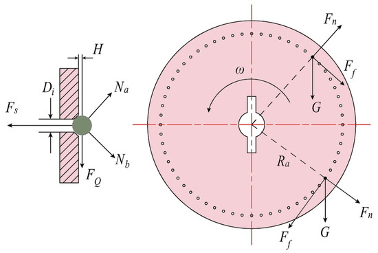 When the suction hole is transferred to the seed-filling area, the airflow generated by the vacuum pump captures the seeds through the suction hole and maintains a stable adsorption state. On the other hand, when the seeds are transferred to the seed-unloading area, the seed-unloading mechanism performs auxiliary seeding on the seeds via relative rotation with the suction hole. Therefore, the size of the suction hole is a key aspect for effective stable capture of seeds and the design of the seed-unloading mechanism. Taking a single seed to be adsorbed by the suction hole as the research object, and assuming that the seed is a rigid body with uniform material, without considering other factors such as vibration and collision between seeds, the force analysis of the seed in the adsorption state is shown in Figure 3. According to the theory of rigid body dynamics, a force equation of the seed is established as follows: