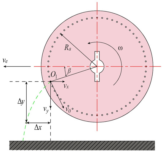 Seed motion after separation from the suction hole is illustrated in Figure 4. Assuming that the seed separation from the suction hole is and the speed of the seed is , the motion equation after the seed leaves the suction hole is as follows: