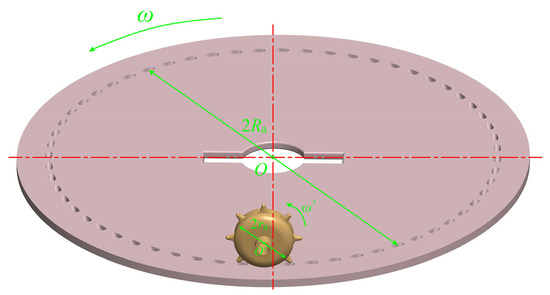According to Equation (4), the seed-filling time is proportional to the number of suction holes . Under fixed conditions of the plant spacing and seed-metering plate diameter, an increase in the number of suction holes causes the plate to absorb relatively more seeds, which is beneficial to reducing the plate’s rotation speed required for actual seeding. The maximum working speed of the designed seed-metering device is 18 km/h. When the plant spacing is 0.15 m, if the number of suction holes , then ; if the number of suction holes , then , whereby the relative speed of the seed-metering plate is reduced by 33% at this time. Therefore, the central angles of adjacent suction holes are set as integers in order to improve the seeding efficiency and ensure processing accuracy requirements. In this paper, the number of suction holes and the center angle of adjacent suction holes are set to and 6°, respectively.