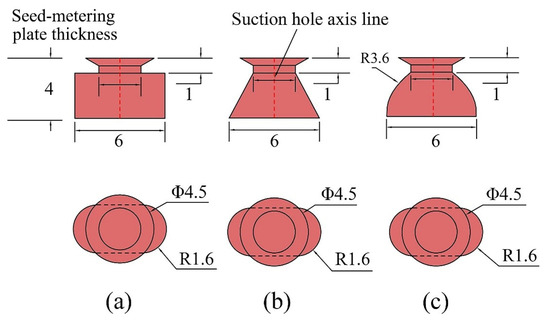 The traditional suction holes in the form of straight holes cannot meet the geometric requirements of the meshing of the knock-out wheel and the suction holes of the seed-metering plate. According to the geometric conditions of their meshing motion, three different suction hole structures A, B, and C are designed as shown in Figure 6. In the process of seed adsorption by the suction hole of the seed-metering plate, the airflow will have an adsorption effect on the seeds, and the seeds will also affect the change of the flow field of the suction hole. The two-phase flow coupling information of the suction fluid domain was analyzed by the discrete element method and computational fluid dynamic (DEM-CFD) coupling method to obtain the optimal suction hole structure.