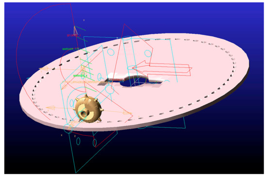 The seed-unloading mechanism, which is located on the rear surface of the seed-metering plate, is mainly composed of a knock-out wheel alongside its supporting mechanism. When the seed-unloading mechanism is working, the knock-out wheel is driven by the rotation of the seed-metering plate, and each tooth of the knock-out wheel meshes with the suction hole. Notably, its working speed can reach 18 km/h, owing to the high speed of the designed seed-metering device, which requires a high meshing performance between the knock-out wheel and the seed-metering plate. There is a need to avoid interference between the knock-out wheel teeth and the suction hole of the seed-metering plate, which can cause instability of the meshing transmission. Therefore, reasonably designing the meshing frequency of the knock-out wheel and the seed-metering plate is imperative to making the meshing stable and reliable. The meshing relationship between the knock-out wheel and the seed-metering plate is shown in Figure 5. To smoothen the mesh, the distance between the teeth of the knock-out wheel in the circumferential direction is made consistent with that of the suction holes of the seed-metering plate in the circumferential direction. This is obtained as follows: