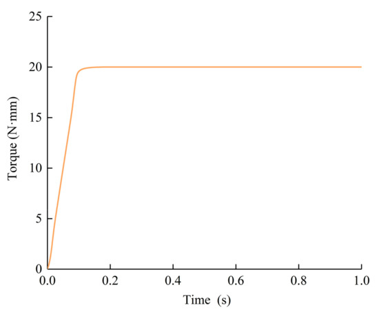 In a high-speed seed-metering device, the force in the meshing process between the seed-metering plate and the knock-out wheel is very complicated. In this paper, we sought to further verify the rationality of the designed knock-out wheel tooth profile and analyze the overall reliability and stability of the meshing process. Specifically, we established a parameterized model of the knock-out wheel and seed-metering plate using the automatic mechanical system analysis software Adams, then performed dynamic analysis of the meshing process. Constraints and driving conditions were added to the parameterized model in Adams software, as shown in Figure 8. Next, we applied a load torque of 20 N∙mm to the knock-out wheel, in order to better reflect the force of the meshing process between the teeth of the knock-out wheel and the suction hole of the seed-metering plate [21]. At the same time, we sought to ensure that the applied load torque does not suddenly change by using the STEP function to make the load act smoothly within 0.1 s, then set the corresponding function as STEP (time, 0, 0, 0.1, 20) and +STEP (time, 0.1, 0, 1, 0). The resulting variation curve of the load torque is presented in Figure 9. In addition, the working speed of the planter was set at 18 km/h, that is, the rotation speed of the seed-metering plate was 2.09 rad/s, the meshing movement time of the simulation model was set as 3 s, and the step size was set as 2000.